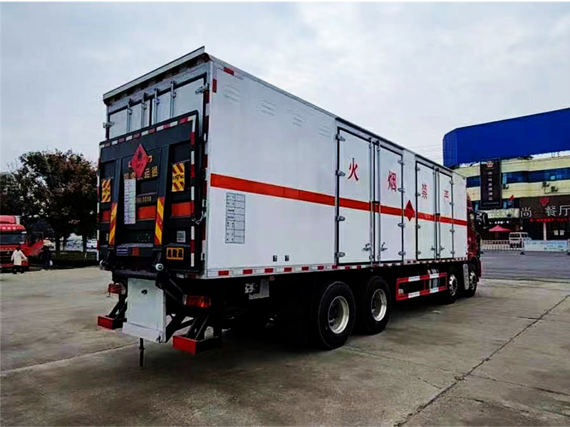 外板采用免漆板及一次性冲压成型具有防雨功能的通风窗,货厢内蒙皮采用合金板有透气孔,复合加铆合工艺,内衬为矩形管骨架牢靠稳定,货厢面板内外蒙皮之间采用阻燃隔热材料填充。厢体外部四周铝合金型材包边,底板和车厢前下部铺橡胶皮,后门双开,可选开侧门,内部装固定货物的卧环或护板,安装烟雾报**器、防盗感应器。车身附件静电接地带、灭火器、防火罩、危险品三角灯、橙色反光带、CCC反射器、菱形标志牌、危险品牌、安全告示齐全。
